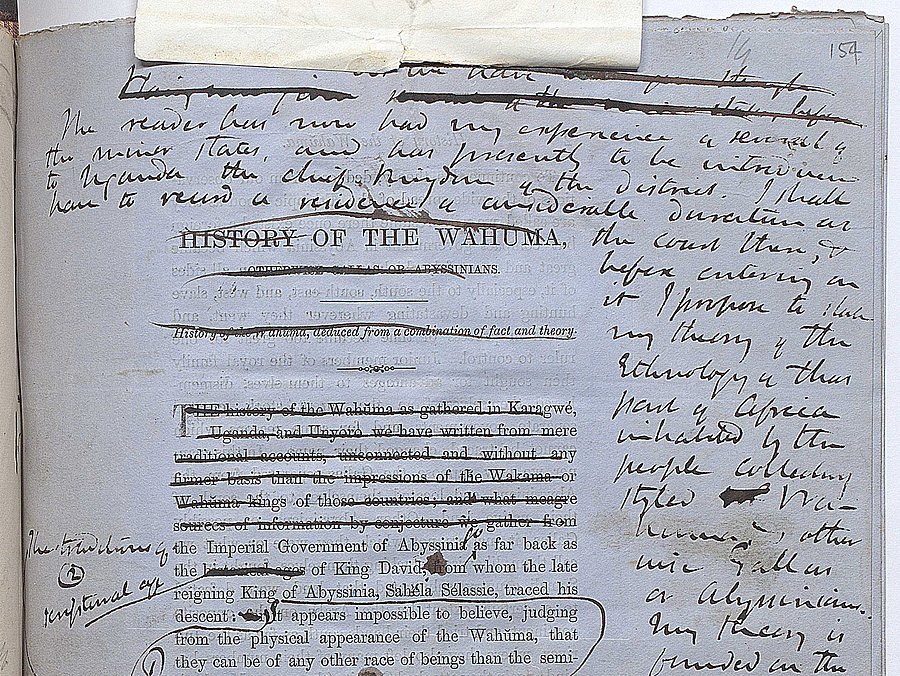 First corrected proofs of ‘Journal of the discovery of the source of the Nile’ by John Hanning Speke, with many stylistic changes by John Hill Burton, the editor of the work, National Library of Scotland, MS.4873, F154.