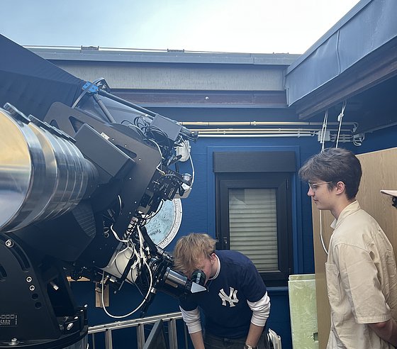 Oben auf dem Dach der Schule standen sechs Celestron-Teleskope mit einem Durchmesser von 26 cm, die in leicht abbaubaren Kästen vor dem Wetter geschützt in einer Reihe angeordnet waren. Hier können sich die Schülergruppen verteilen und an die Arbeit gehen. Alles liegt in der Hand der Schüler*innen. Sie bauen auf und ab, beobachten, fotografieren, bearbeiten und dokumentieren, was auch immer sie sehen und geschieht. Bei sich einstellenden Mängeln oder Unzulänglichkeiten, weil sich beispielsweise ihre Fragen nicht zufriedenstellend beantworten lassen, fangen sie an zu tüfteln, erfinden Lösungen und konstruieren Verbesserungen. So entwickelten sie über viele Jahre hinweg ein unvorstellbares know how.