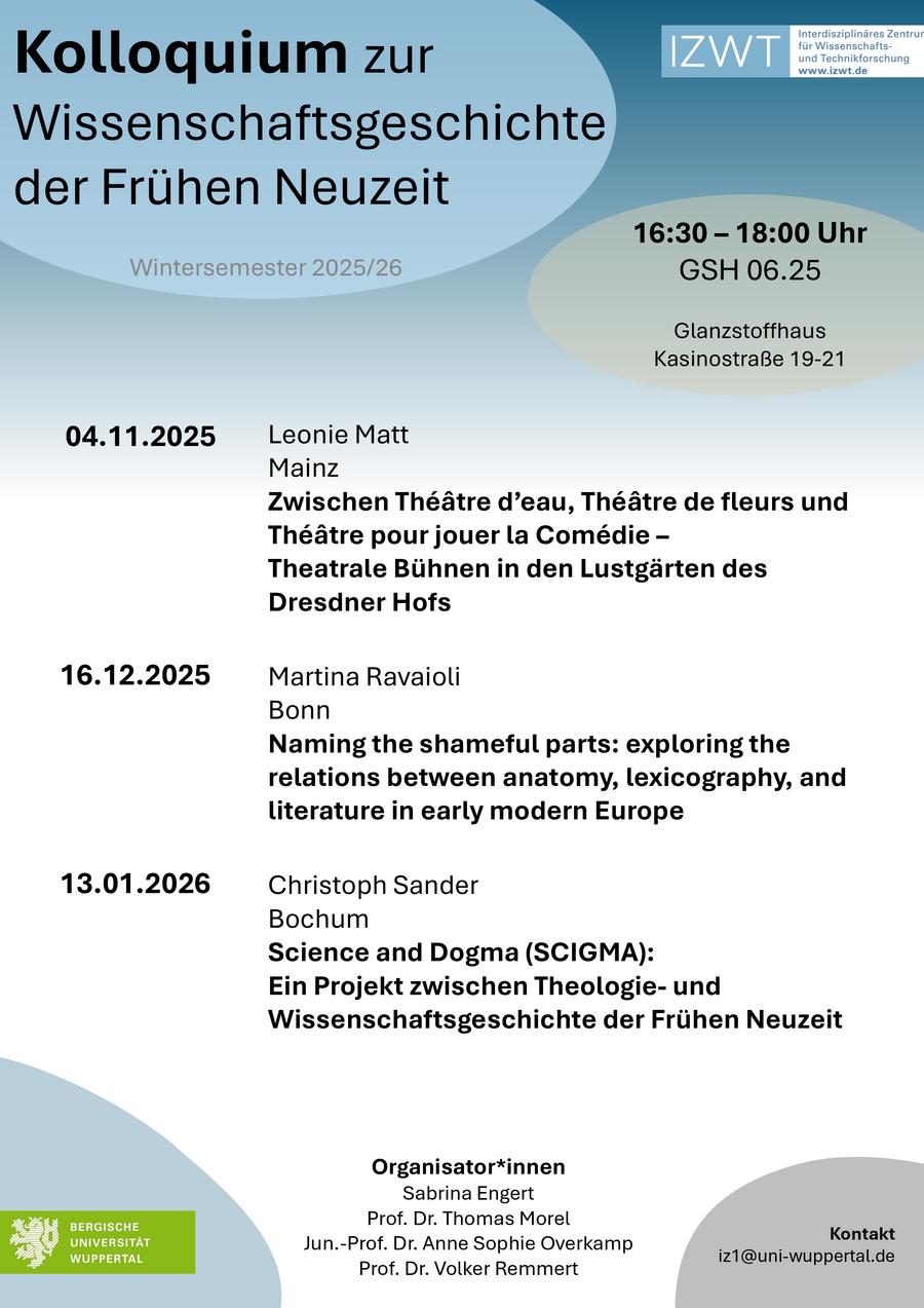 Der Vortrag von Leonie Matt, "Zwischen Théâtre d’eau, Théâtre de fleurs und Théâtre pour jouer la Comédie – Theatrale Bühnen in den Lustgärten des Dresdner Hofs" (4.11.25), entfällt.